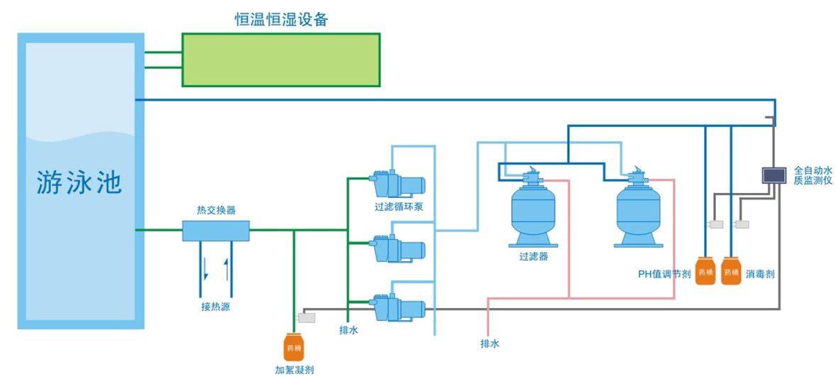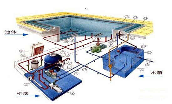 游泳池水質(zhì)處理系統(tǒng)遵從動(dòng)態(tài)平衡工作原理,在循環(huán)處理過程中達(dá)到水質(zhì)的徹底凈化。