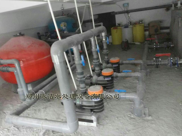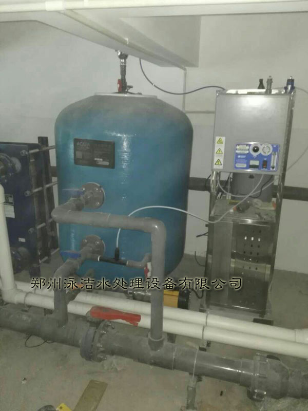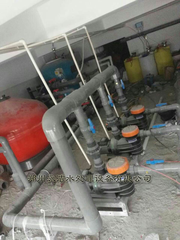 機(jī)房內(nèi)部已經(jīng)安裝完畢、次游泳池采用的是逆流式、采用的是砂缸循環(huán)過濾系統(tǒng)、臭氧反應(yīng)器、板式換熱器、水箱等游泳池水處理設(shè)備